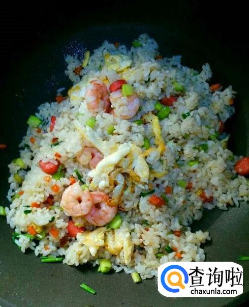 虾仁炒熟之后将蛋炒饭重新倒进锅里面,加一点点食盐然后快速翻炒,这样炒出来的蛋炒饭不用加水也不会糊锅,非常的好吃。