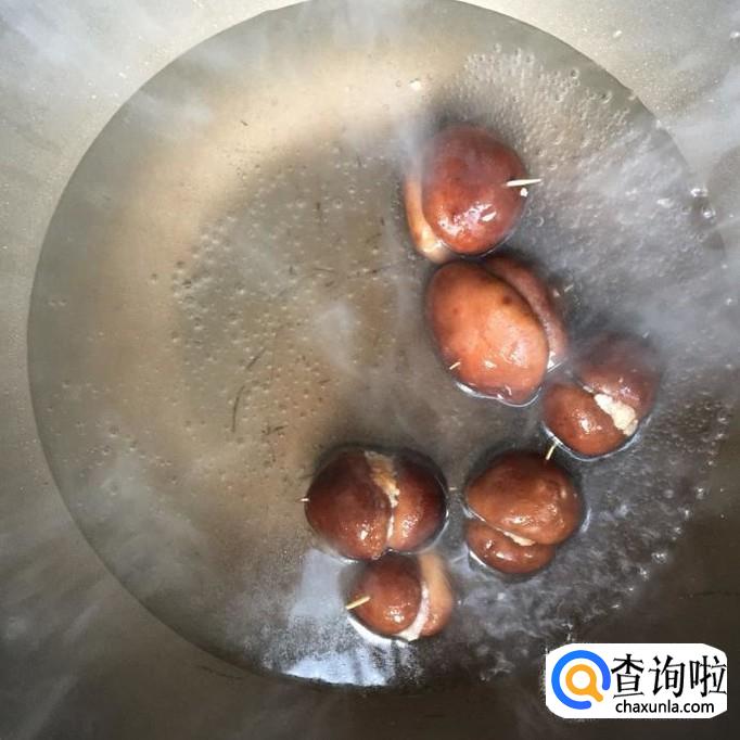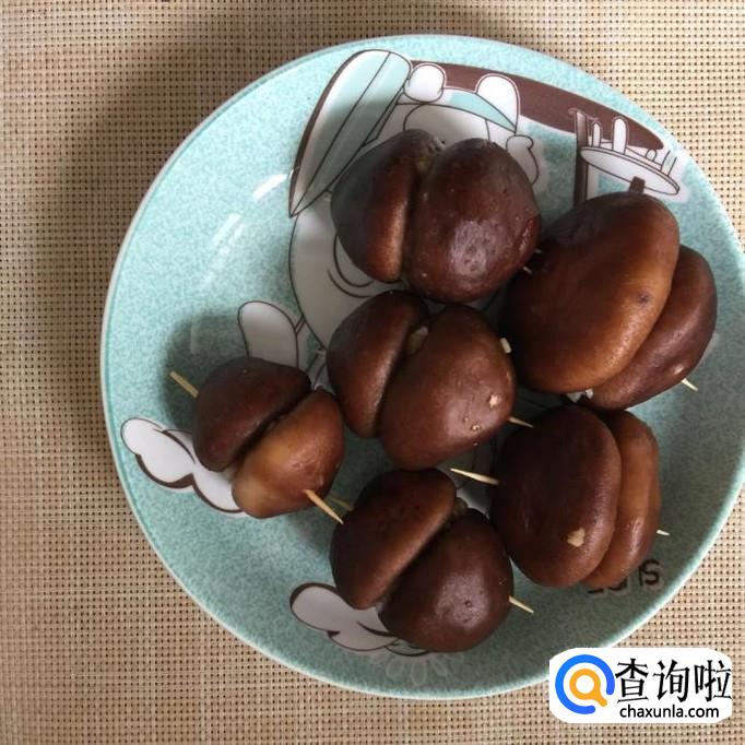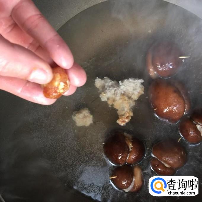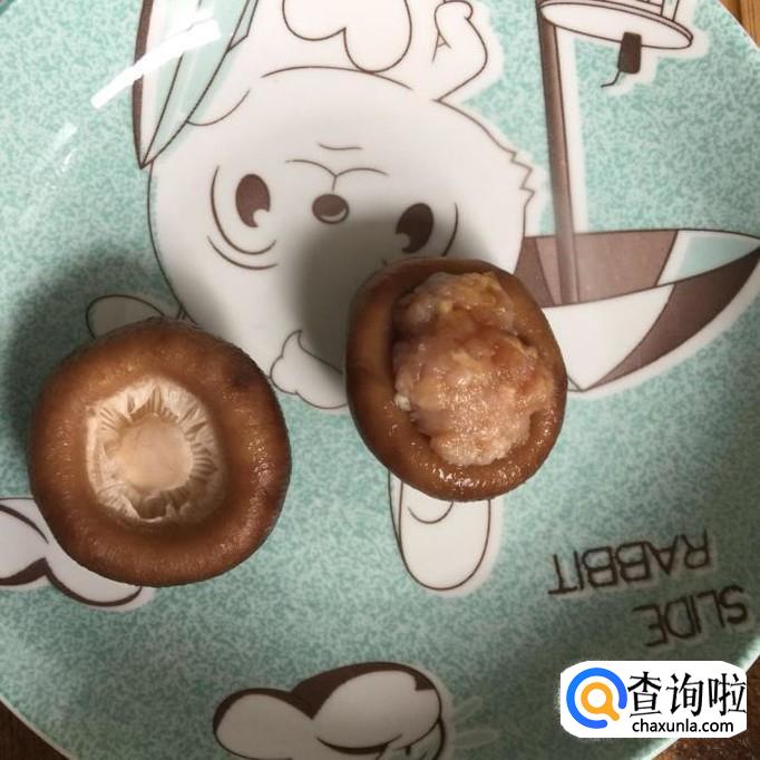 接着取两个大小差不多的香菇,其中一朵塞满肉泥,另一朵则盖在上面并用牙签穿起来,如下图所示。