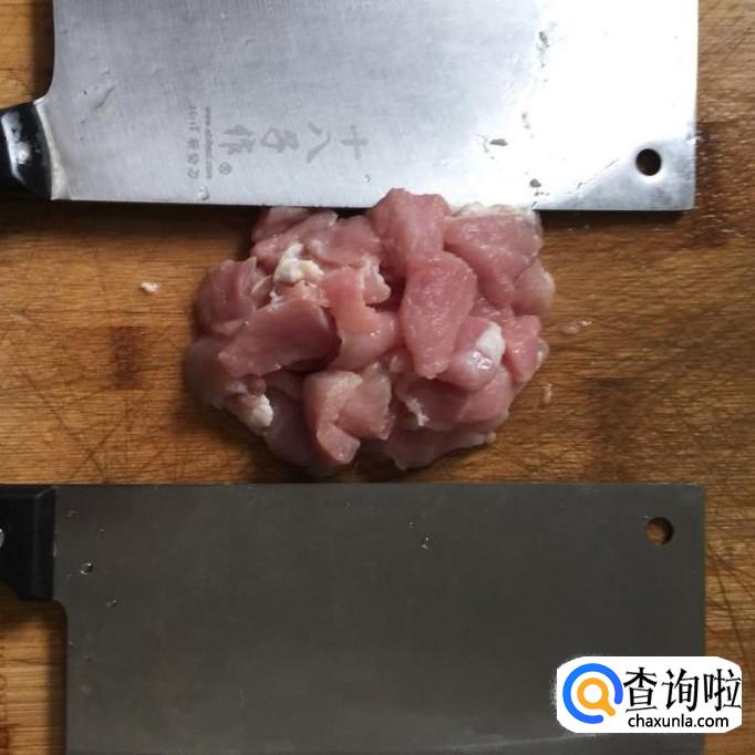 首先将瘦肉切成瘦肉片,然后用两把刀把瘦肉片和蒜头剁成肉泥,如下图所示。