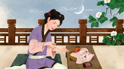 “对月穿针”,是指七月初七这天傍晚,家家户户都把庭院清扫干净,年轻妇女和姑娘们先要向织女星虔诚跪拜,乞求织女保佑自己心灵手巧。然后,她们把事先准备好的五彩丝线和七根银针拿出来,对月穿针,谁先把七根针穿完,就预示着将来她能成为巧手女。