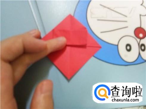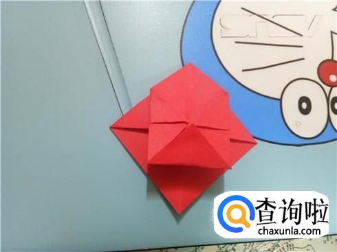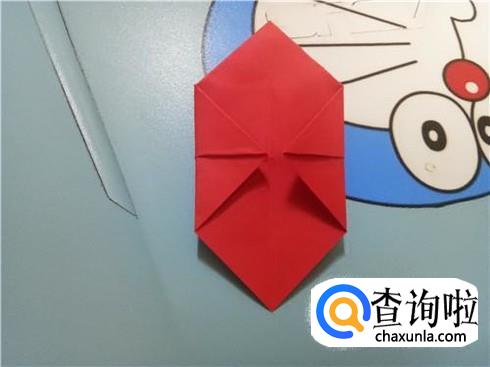 我们将右边的未折叠过的部分轻轻的向左边翻转过来,下边的部分也是如此。再将两边的角沿着中间的这条线给对折过来,将下边突出的小三角形给折叠上去,再将下边的这部分给翻转上去。