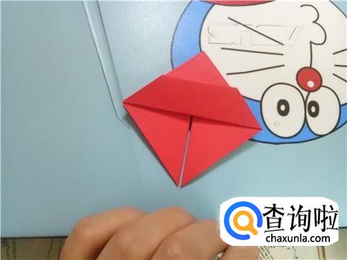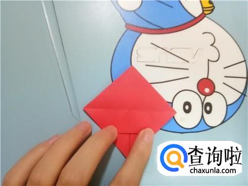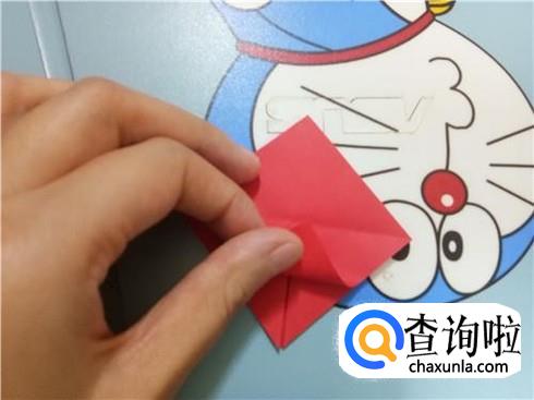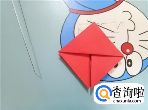 我们将下方开口边的上面一层对折到它的另外一个顶点,再将它放回来,将它下方的这个角对折到刚才的折痕处,并且将刚才折叠过的部分沿着刚才的折线给它向上对折过去。
