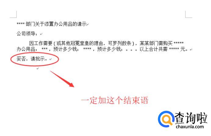 接下来请示内容写完以后一定加上“妥否,请批示”,如下图所示