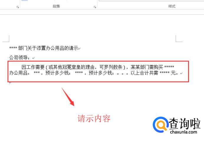 接着就是请示内容,需要简明扼要的概括事项,条理清晰,不拖泥带水,如下图所示