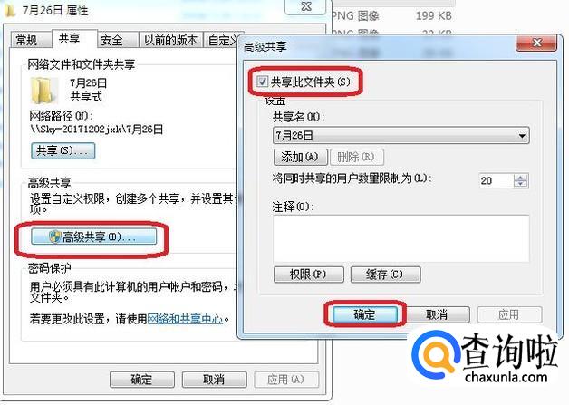 在文件夹属性选项框中,点击“共享”标签,再点击“共享”按钮,如图所示。
