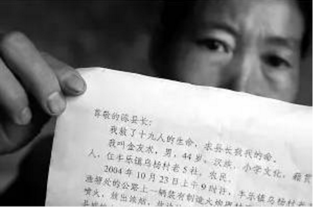 尊敬的陈县长: 我救了十九人的生命,求县长救我的命。我叫金有树,男,44岁,汉族,小学文化,籍贯重庆市开县人,住丰乐镇乌杨村老5社,农民。 2004年10月23日上午9时许,丰乐镇乌杨村老5社小垭口渔塘处的公路上一辆装有制造火炮器材开往厚坝方向的货车突然喷火,放出浓烟,坎边的野草被烧焦,此刻正巧一辆载人开往县城的中巴车路过,因火和浓烟的突然袭击而迷失方向开入塘中,此况被该地村民金友现看见,立马呼救,其弟金友术率先奋不顾身跳入塘中,打烂中巴车后面玻璃,将被淹的19名乘客抢救上坎,其中有老人、中青年、小孩、孕妇,还有几个月的婴儿。 等交警到时,救人已结束。因当天是阴雨天,气候寒冷,忙于给被救人员火烤、换衣,自己却没顾得上换衣服,时间过长,自己呛了水患肺病,病情逐日加重。 家里有三口人,子幼,全靠两口子务农维生,妻患有心脏病,长期药沙罐不断,曾住过院。2004年12月我的病情恶化,到县人民医院去就医,耗用了近万元的医疗费还不见好转。2005年2月转到重庆西南医院治疗,经检查是肺出血,要作切除手术,预计医疗费4万余元。面对此况贫民实在无能力承受,亲、朋家境也不富,好事该做,病魔无钱对付。病魔无情人有情,闻陈县长爱民如子,“9·4”洪灾中已显为民之情,无法中违心只好写此申请,请县长给予人道的帮助。 此致敬礼申请人:金有树2005年2月18日