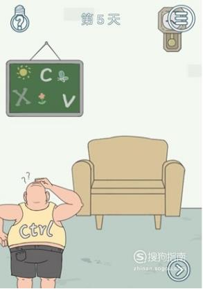 在第一页,点击获取小胖子身后的ctrl,再把它拖到小黑板上X位置,合成获取ctrl+X。在第二页,把ctrl+X给爸爸,接下来回到第一页,把ctrl+X给黑板上的V,然后把ctrl+V给到第一页沙发即可让爸爸在第一页的沙发上出现。回到第二页点击沙发上的钱即可。