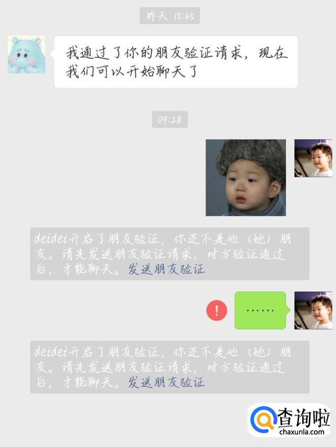 会出现对方验证后才能聊天的消息提示,那对方就是把你删除好友了。继续发消息在你发出的消息前出现红色感叹号。如图所示