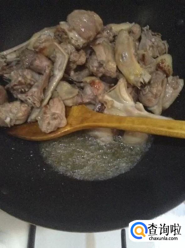 锅烧七成热放一勺花生油,把配料的一半放下去,再倒上一勺料酒,油热后开大火爆炒鸭肉。
