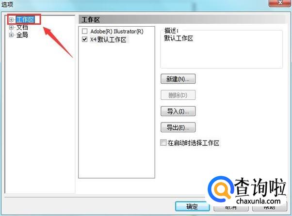 点击选项在弹出的对话框内找到工作区选项,如图所示: