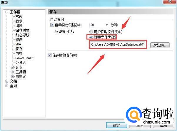 点击保存选项,在右侧找到始终备份到选项里的特定文件夹选项,然后设置保存的路径,这样自动保存的文件就可以在这个路径里找到了,如图所示: