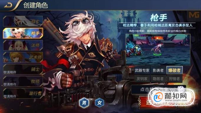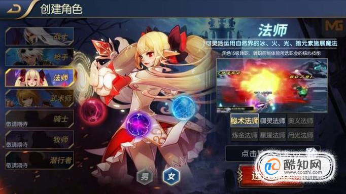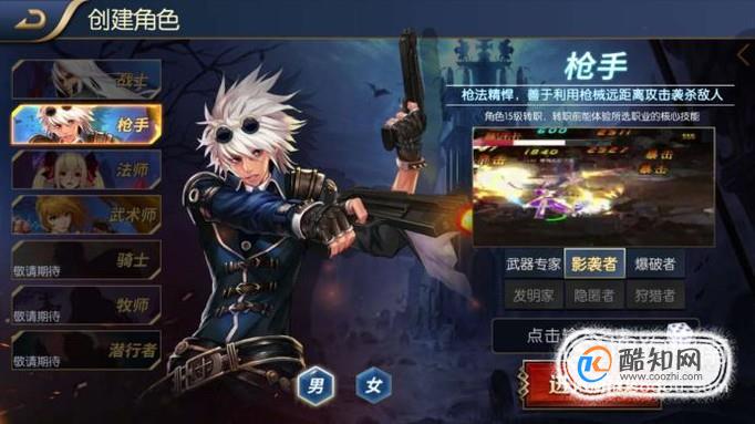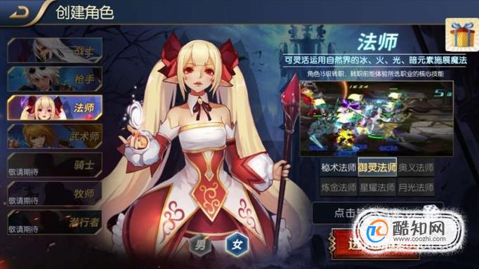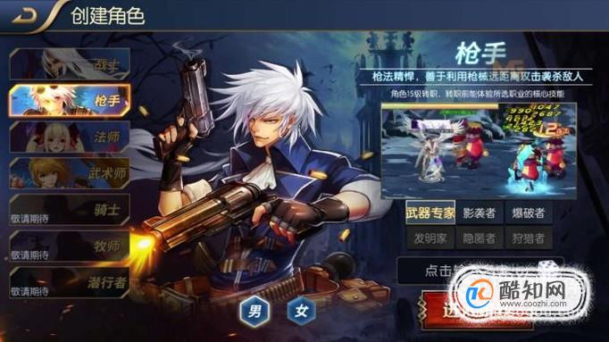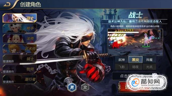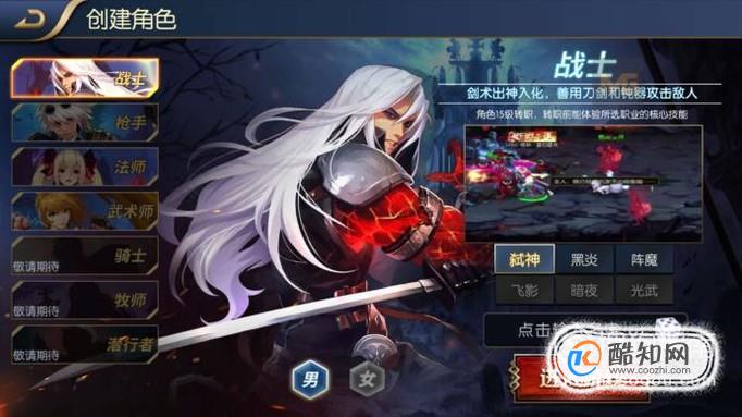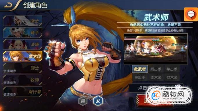 游戏目前有四个职业可供选择:战士、抢手、法师、武术师;