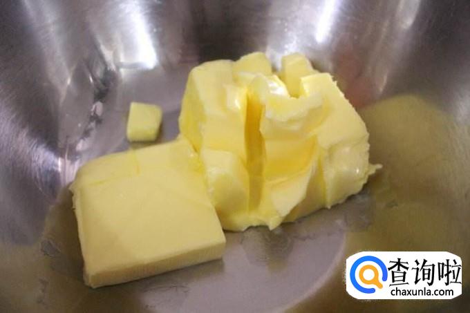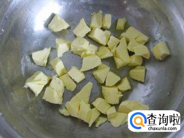 将切好的黄油放在室内软化,大概半个小时,根据季节不同,软化时间不同。软化至黄油可以轻轻的用手指或者筷子戳出窟窿为佳。也可以用微波炉加热至可以戳出窟窿。