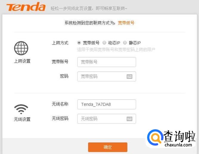 这款腾达路由器设置很简单,输入IP地址后会直接进入设置界面,在这个界面输入宽带账号和密码,以及无线名称和无线密码,点下面的“确定”。
