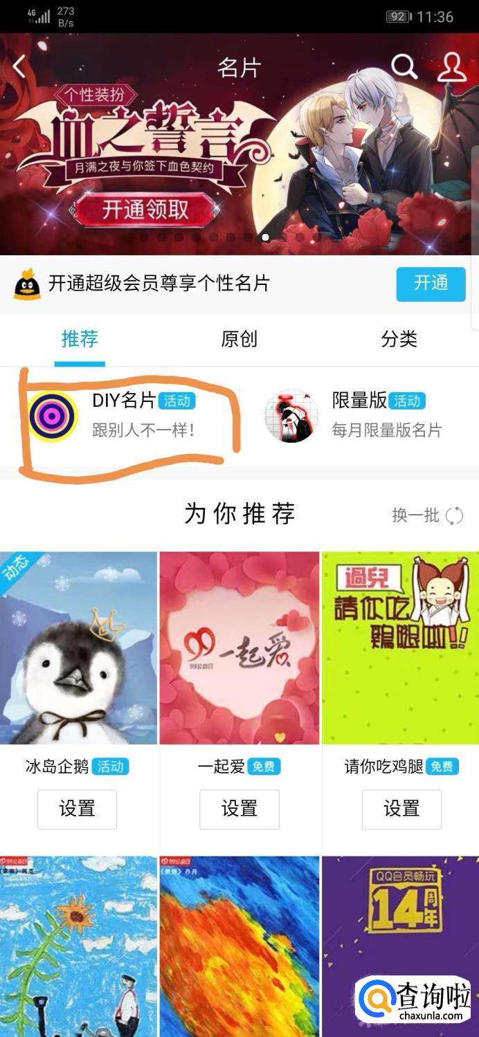 进入到【名片】页面之后,点击方框内标注的【DIY名片】。