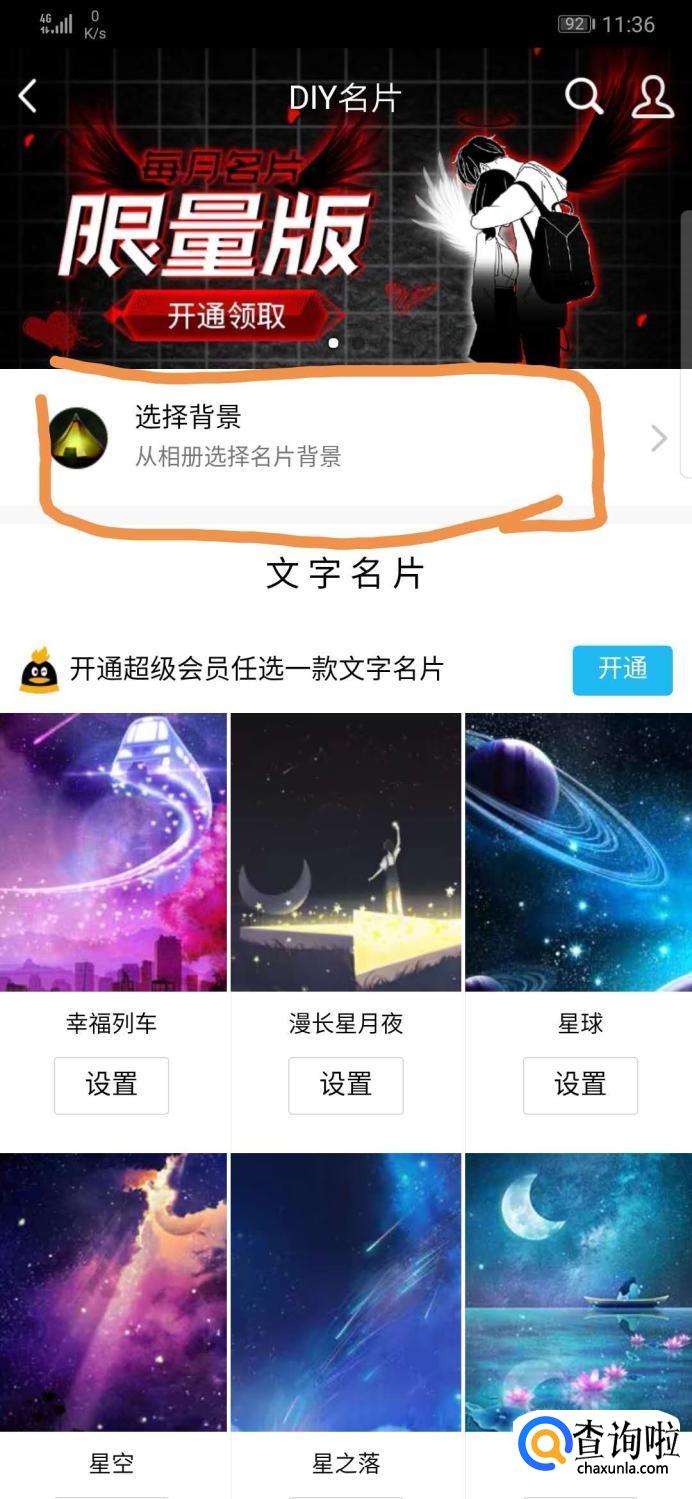 进入到【DIY名片】之后,出现如下界面,需要点击方框内标注的【选择背景】。