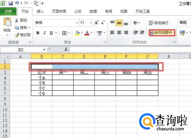 之后我们选中表格上方的单元格区域,然后我们点击合并后居中;