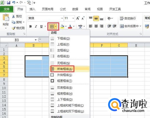 之后我们点击边框按钮边上的下拉箭头,弹出的界面,我们点击所有边框;