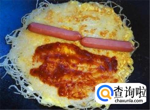 鸡蛋开始凝固之后,将烤冷面翻一下,然后用刷子将刚刚调好的汁刷在烤冷面上,然后放上一根火腿肠,撒上点葱花或者是香菜末。