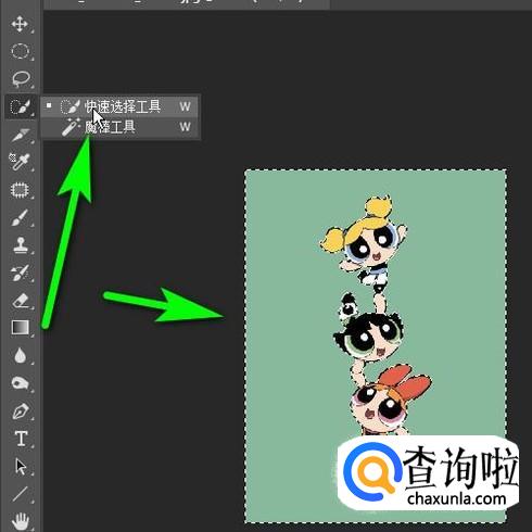 接下来,要把图片中三只小动物抠出来。在工具栏中调出快速选择工具,再把图片背景选中。
