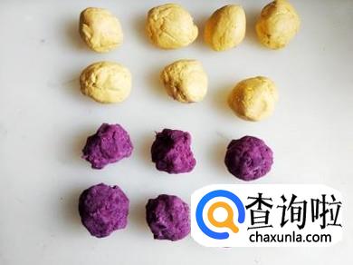 接下来我们就可以把南瓜泥、紫薯泥分别和淀粉混合制成南瓜面团、紫薯面团,根据自己的喜好把面团弄成自己喜欢的形状。