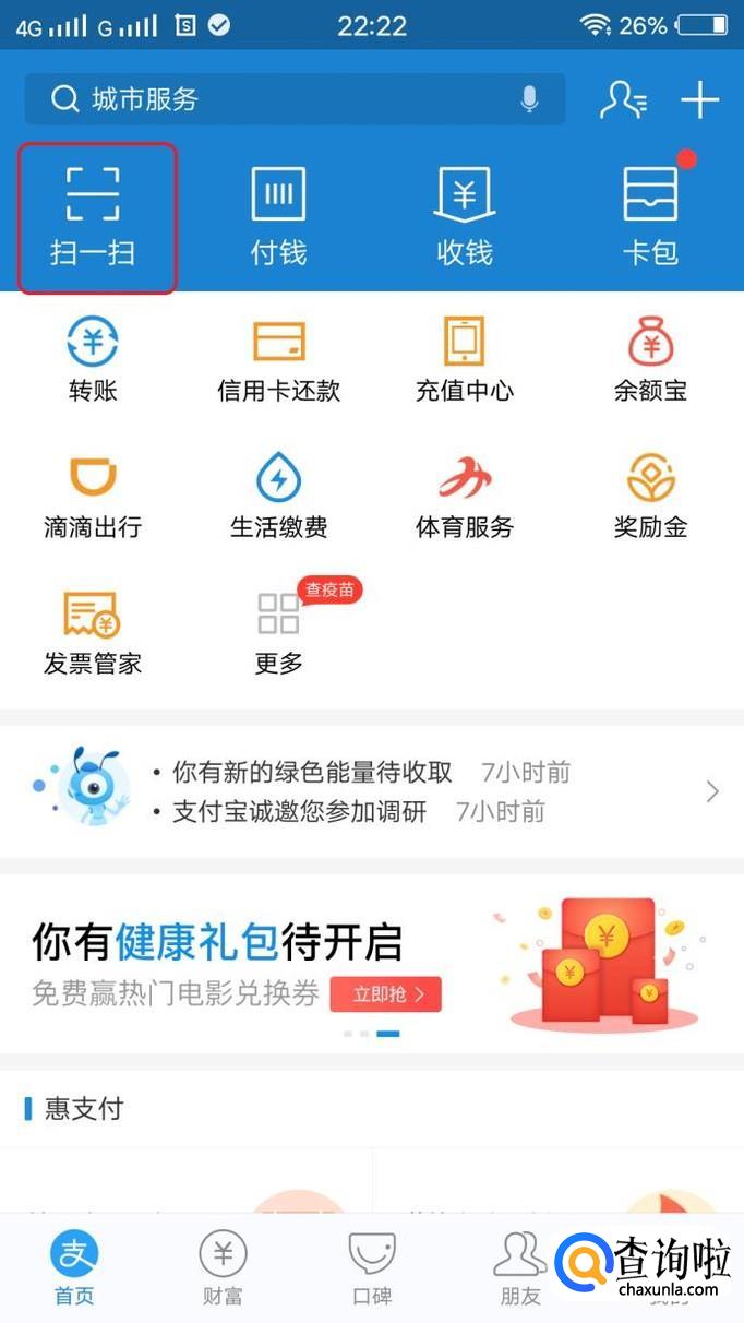 首先,我们比较常用的支付宝“扫一扫”,打开手机支付宝,首页左上角就是,点击就可以扫描。