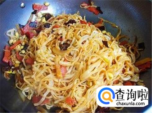 火腿切片,豆芽掐掉头尾焯一下水,锅里放油,加上一些蒜末和姜丝,将火腿和豆芽放进去,加上一点水并加调料,最后放面条焖熟即可。