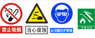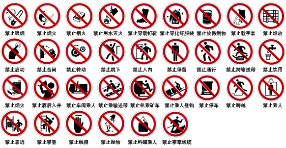 安全标志根据国家标准规定,安全标志由安全色、几何图形和图形、符号构成。根据《安全标志及其使用导则》,国家规定了四类传递安全信息的安全标志,有禁止标志、警告标志、指令标志、提示标志。禁止标志表示不准或制止人们的某种行为;警告标志使人们注意可能发生的危险;指令标志表示必须遵守,用来强制或限制人们的行为;提示标志示意目标地点或方向。