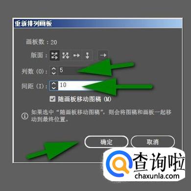 在设置面板中,把列数设置为5;把间距设置为10;再点确定。那么,这20个画板就整整齐齐的排列成5列4行了。