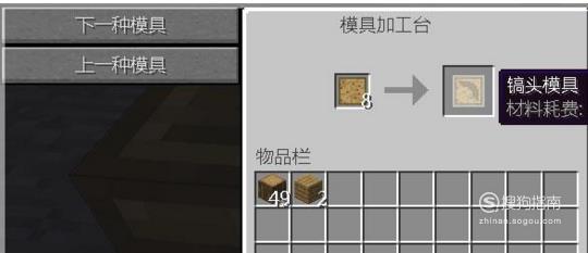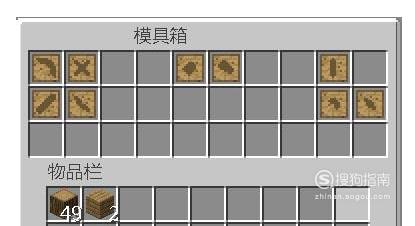 第一次制作工具,我们需要合成一些模板,然后将它们放入模具桌进行开孔处理。将模板放入后,点击左边的按钮,找到需要的模具,取出。