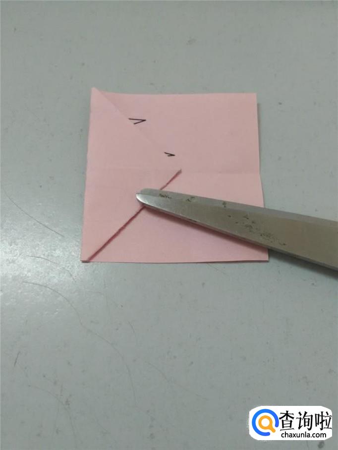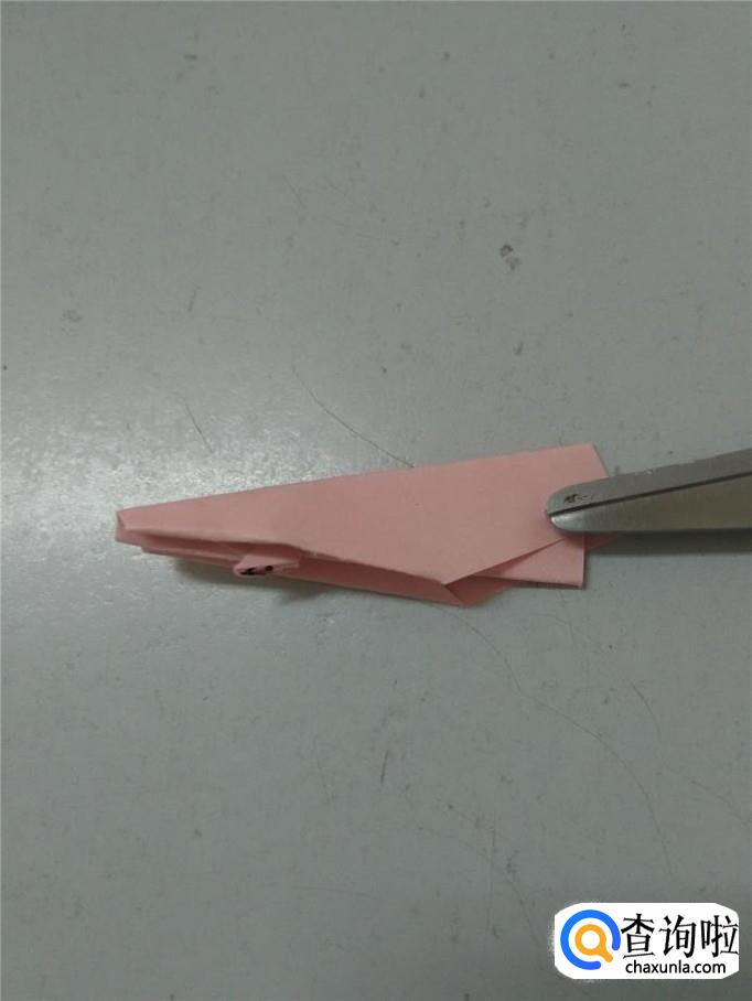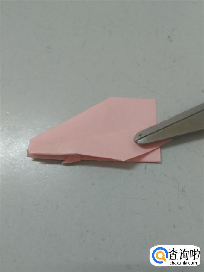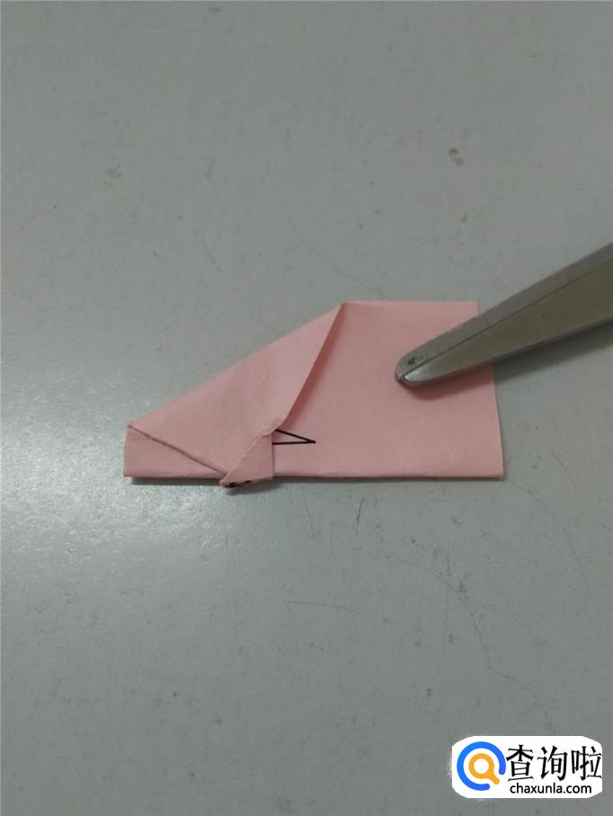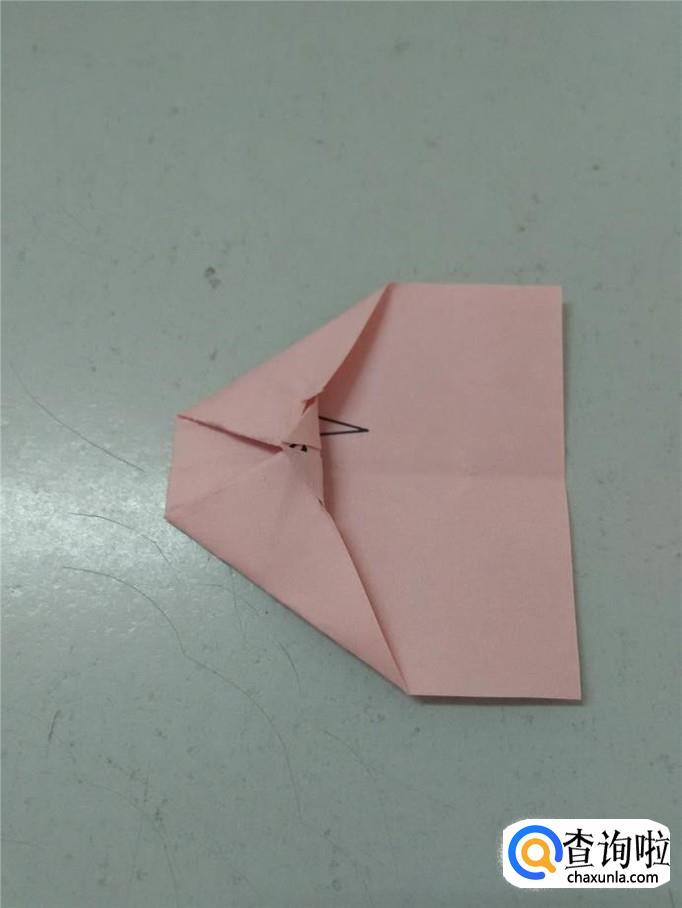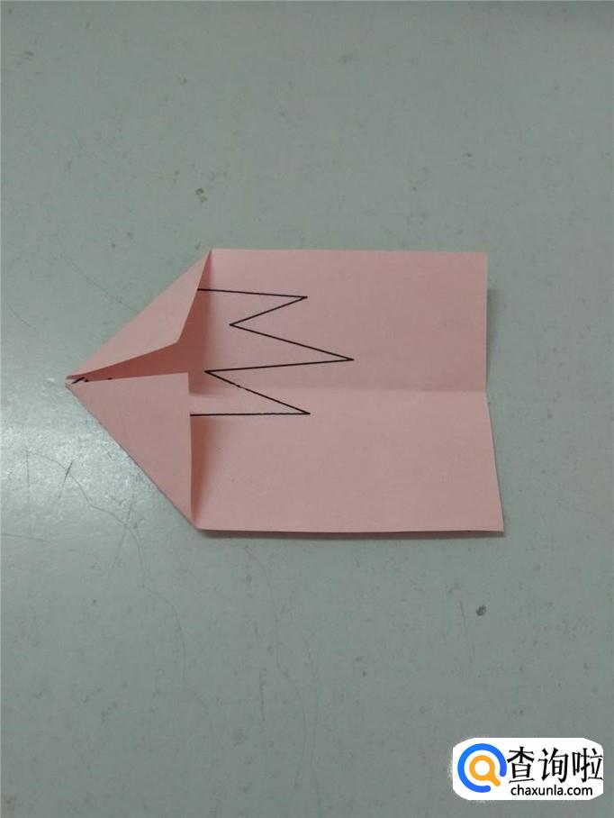 把彩纸打开,左边两个角往中心折,折成一个箭头。