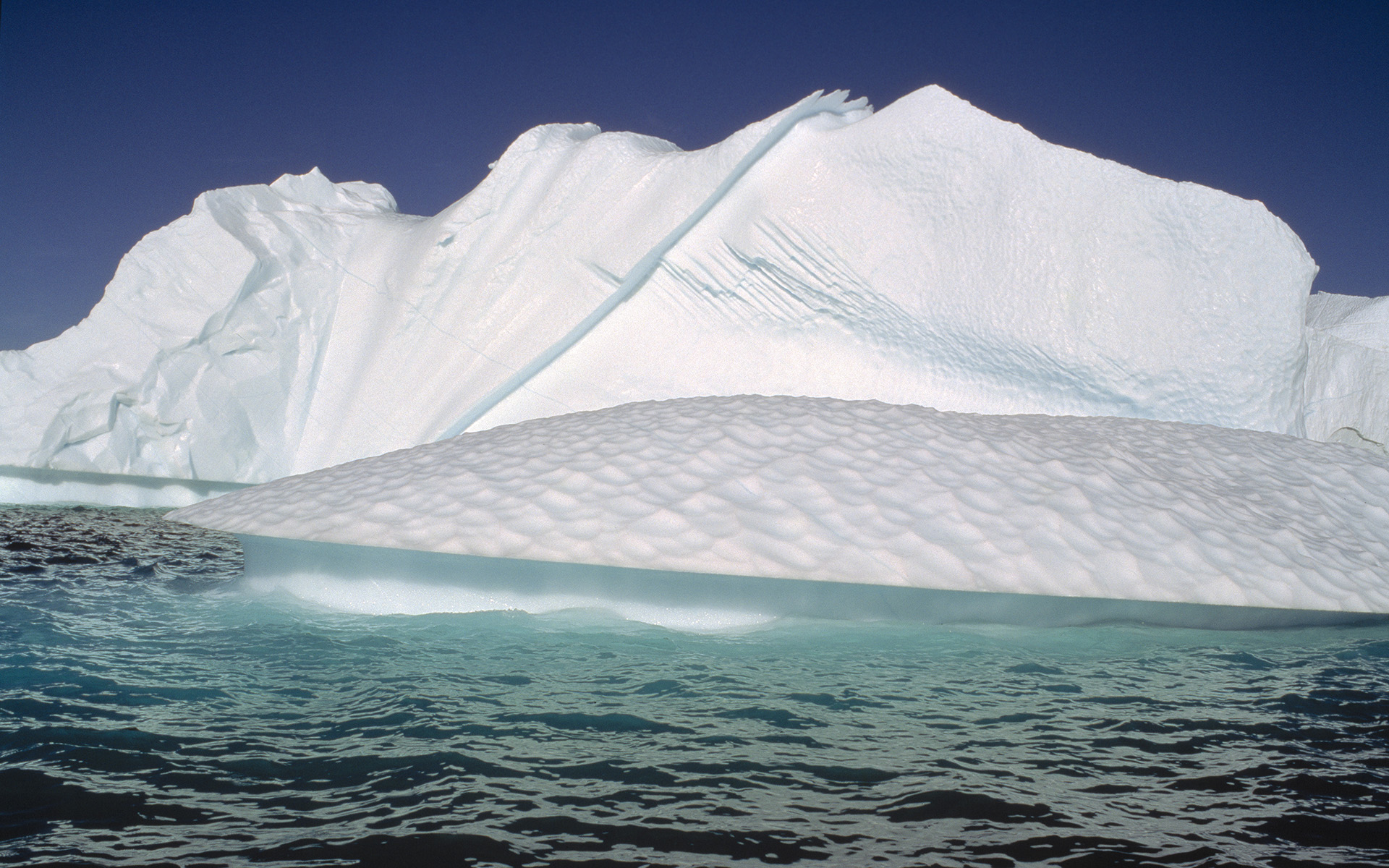 冰山水下部分的大小是水上部分的大约7倍。这是因为冰山是淡水的冰造成的,淡水的重量是海水重量的大约7/8。如果是在淡水里,冰山的大约9/10将沉入水面以下。冰山的水下部分可能比可以看到的部分的一边伸出去很远,因此船舶驶近了可能撞上它。巨轮泰坦尼克号就是这样给碰上的,1912年4月15日沉没在纽芬兰附近,约有1500人丧生。