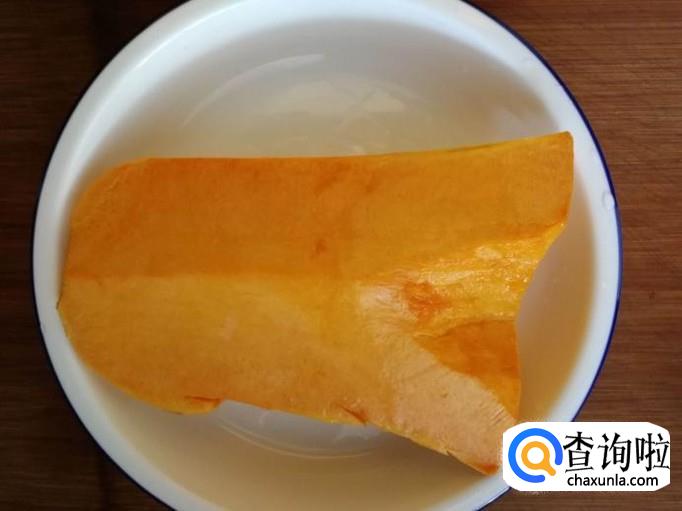 挑选掂着更重的黄南瓜,剖开切块后,将南瓜削去外皮,清水洗净。