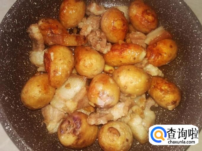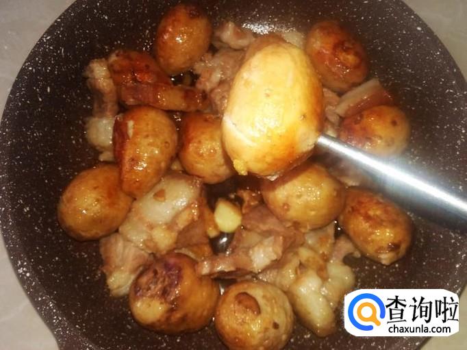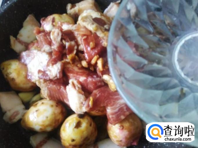 把剩下瘦肉铺在小芋头面上,然后加半碗水进去。