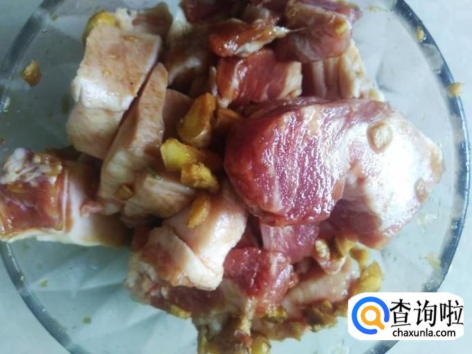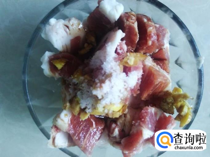 五花肉切成片,加适量的盐、姜蓉、生抽、料酒腌制几分钟。