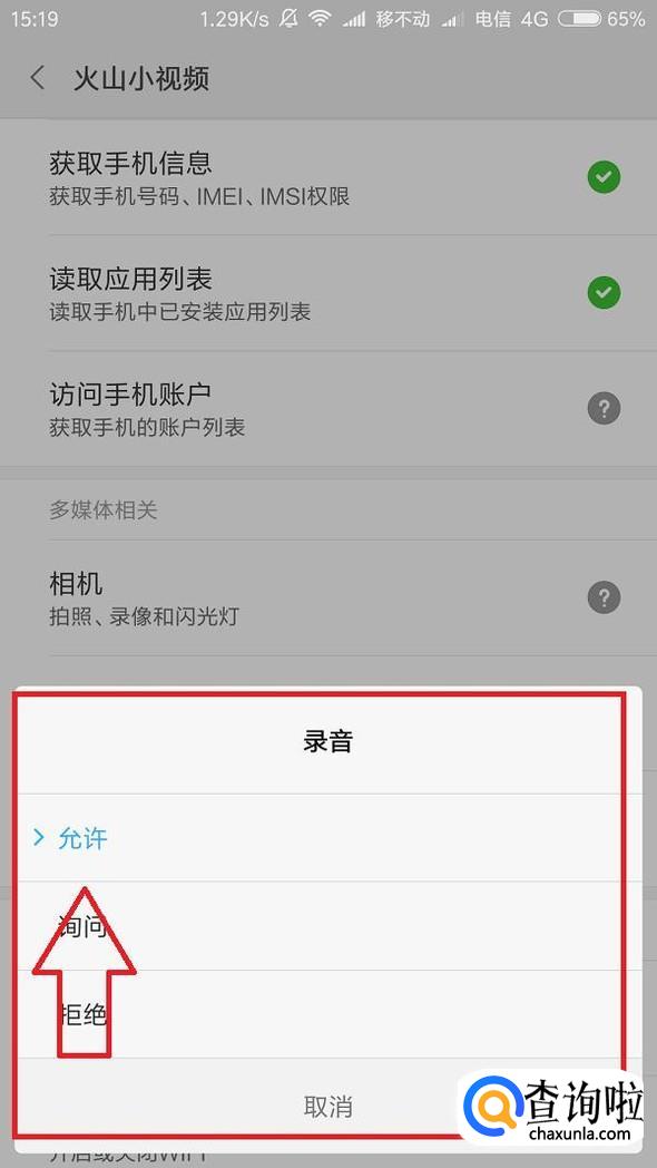 然后我们再点击“应用权限管理”,然后在里面找到火山小视频APP,并点击进入,在页面里我们找到火山小视频APP的录音拍摄权限管理按钮,将拒绝改为允许就可以啦,小伙伴们快去试试吧。