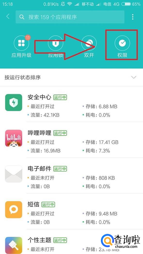 然后我们在应用管理页面里点击“权限”,进入我们手机应用的权限管理中心里。