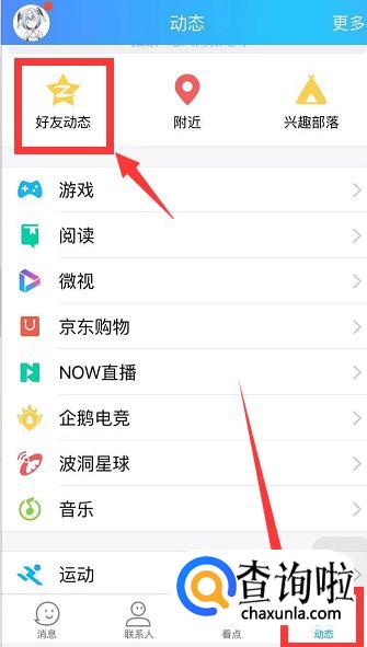 然后点击右下角【动态】,选择【好友动态】。
