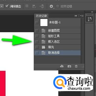 在“历史记录”的小面板中,可以看到一共有五步的操作,这五步操作就是刚才我们在画矩形时所经历的步骤。在最底下的这一步“取消选择”就是第五步的操作,当前显示的是蓝色状态。