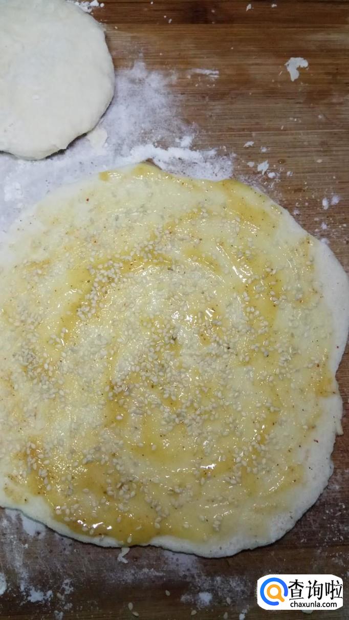 将面片和油酥按照1:1的比例做成油酥,均匀的抹在面片上面,再撒上一层白芝麻。