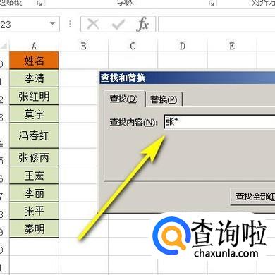 弹出查找对话框,在查找内容这里输入:张*;再点:全部查找