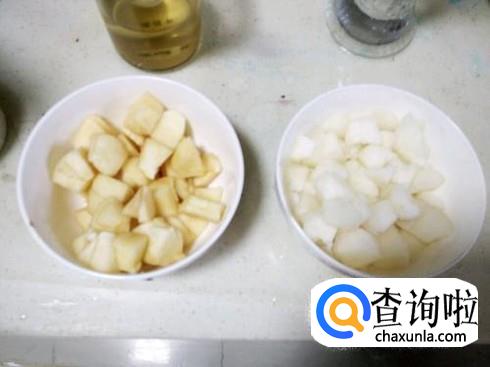 把梨子切成小块状,然后放在盘子里面准备好,然后,这时候一定要注意要先把银耳先拿出来泡一个小时。
