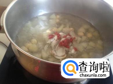 稍微煮几分钟后撒上一些枸杞,观察锅中的水位变化,等到降了一点以后就可以关火了,然后梨子汤就可以喝了。