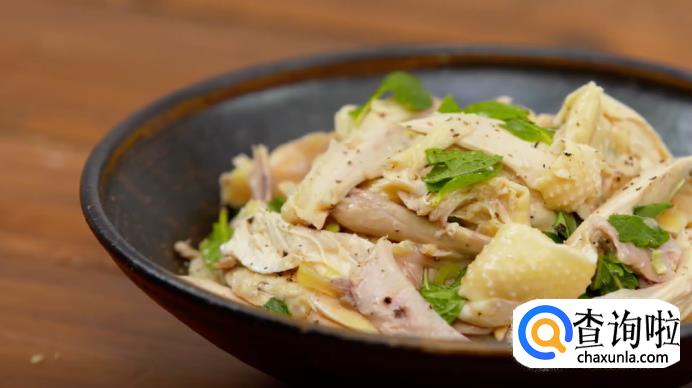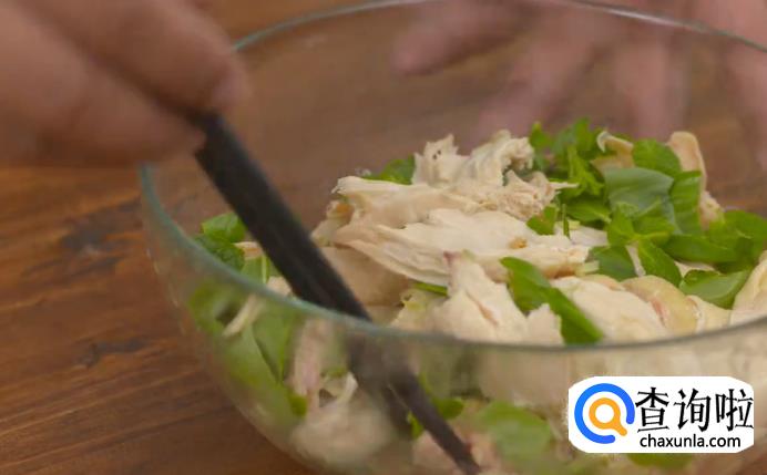 等鸡完全煮熟之后,将其捞出,趁热撕成鸡丝,再加入罗勒、薄荷和柠檬草,一起搅拌均匀。