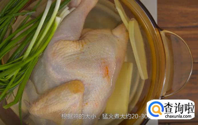 然后,整鸡冷水下锅,放入葱和姜,根据鸡的大小,猛火煮20-30分钟左右。