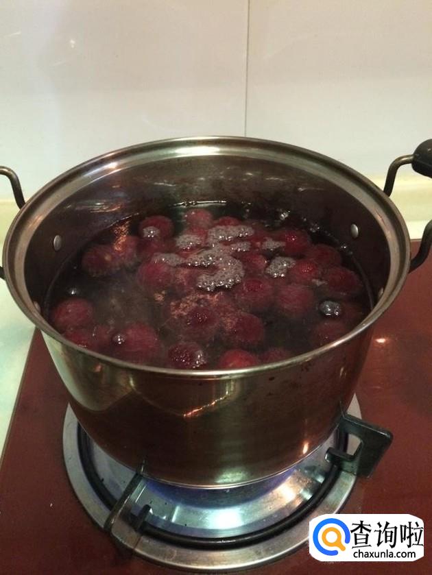 这个时候我们可以准备一个小锅,倒入足量的水、冰糖,烧开后把杨梅倒进去小火煮等汤汁浓稠就可以出锅了。