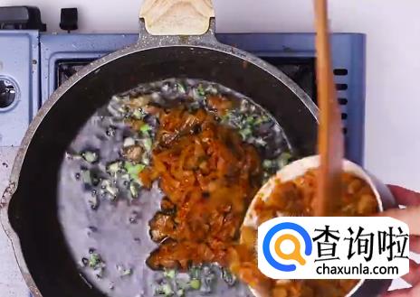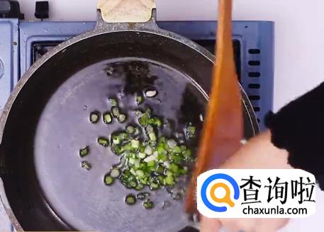 热锅起油,倒入小葱和泡菜,不断翻炒。