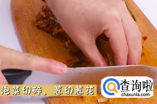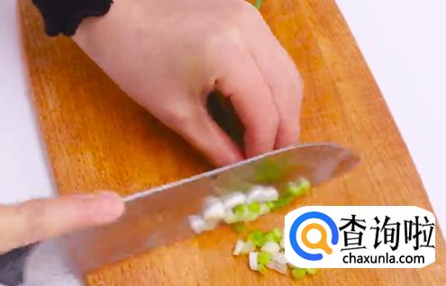 将泡菜切碎,葱切成颗粒状。