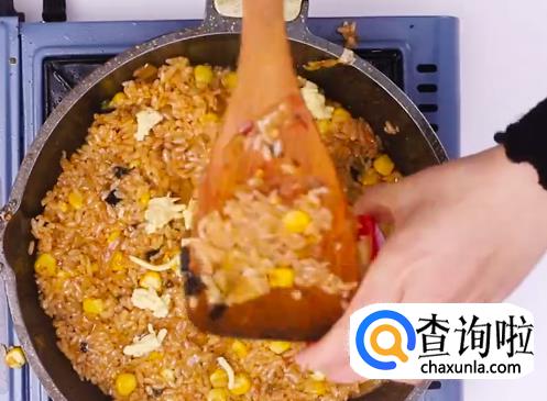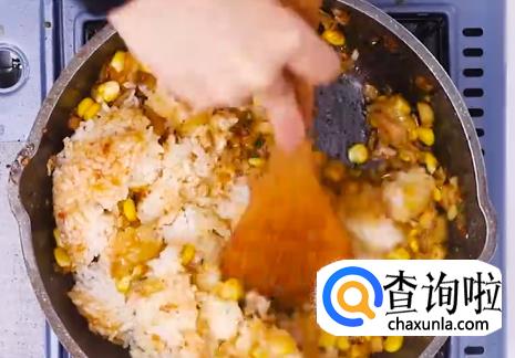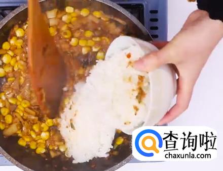 将玉米粒倒入,再将米饭倒入,然后开大火不断翻炒。