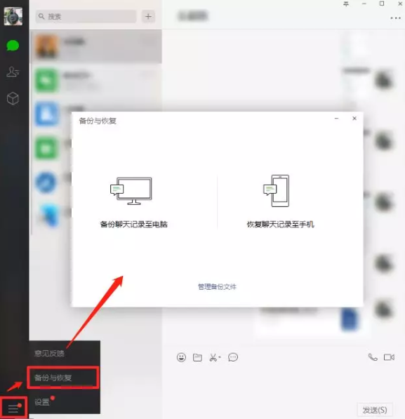 此方法是与删除了聊天记录恢复一样的方法,要先备份数据到电脑,同样适用于更换手机等情况来恢复聊天记录。首先要确保电脑端和手机端的微信要连接同一个WiFi,然后打开电脑端的微信,点击左下角“更多”——“备份与恢复”——“恢复聊天记录至手机”。可以直接将电脑端的聊天记录全部备份到手机端,也可以根据你想要备份的时间、好友和具体的内容进行备份。